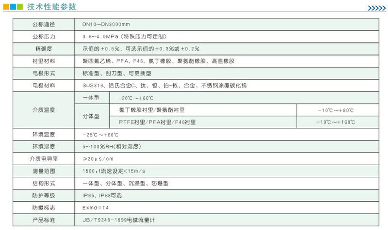 電池供電型電磁流量計技術(shù)參數(shù):·公稱通徑:DN6-DN1200·公稱壓力:0.6 ~ 4.0MPa (特殊壓力可定制) ·精確度:± 0.5%(DN10 — DN250) ;± 1.0%(DN300 — DN1200) ·測量范圍:0 ~ 12m/s ·測量介質(zhì)電導(dǎo)率:> 20 μs/cm ·介質(zhì)溫度:-10℃~ 100℃ ·環(huán)境溫度:-25℃~ 60℃ ·環(huán)境濕度:≤ 95% (相對濕度) ·供電方式:電池供電型電磁流量計擁有 3.6V/DC 內(nèi)置鋰電池供電,連續(xù)工作時間大于5年 ·電極材料:316L不銹鋼、HC、HB、鈦、鉭、鉑/銥合金 ·襯里材料:聚氯丁橡膠、聚氨脂橡膠、PTFE、F46、PFA ·連接方式:法蘭式,插入式·結(jié)構(gòu)形式:一體型、分體型·防護等級:IP68